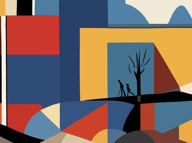 Hand drawn digital artwork inspired by the Pop Art and Bauhaus styles. The artwork called 'The Walkers' was fully hand drawn on a iPad Pro using an Apple Pencil and Procreate software.