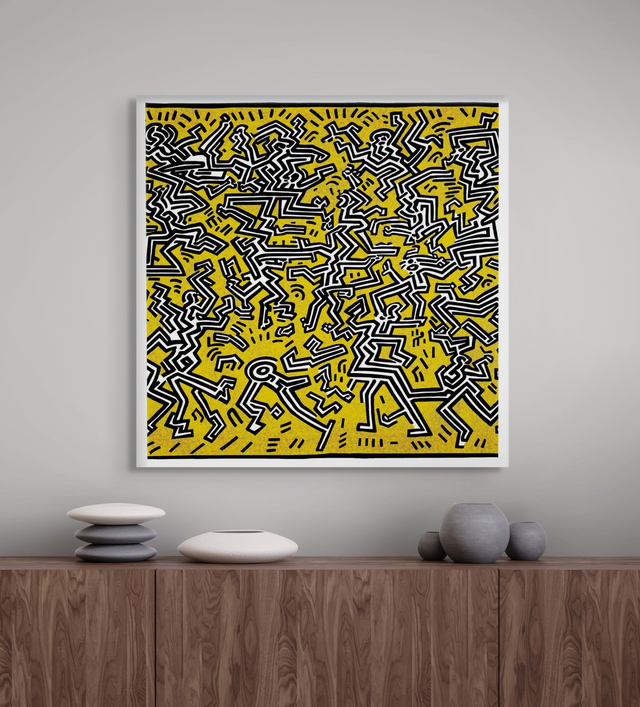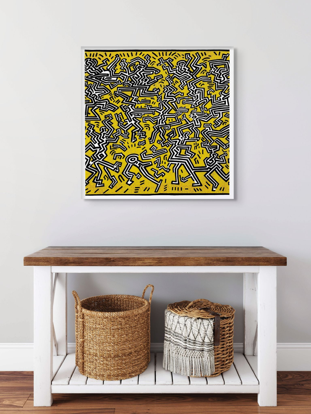 Abstract Pop art inspired by the works of Keith Haring. Digitally hand drawn on an iPad and then professionally printed. Available as a high quality stretched canvas, ready to hang and available in four sizes.