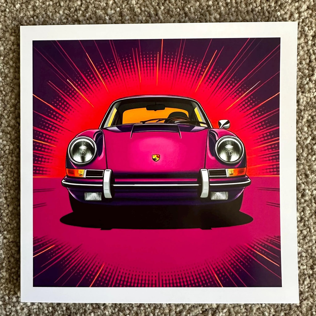 Classic 1960s Purple Porsche 911 Pop Art Greeting Card – Retro Car Enthusiast Gift, Bold Design for Birthdays, or any Occasion or collectors
