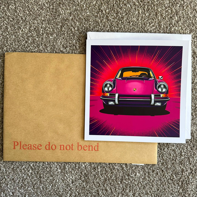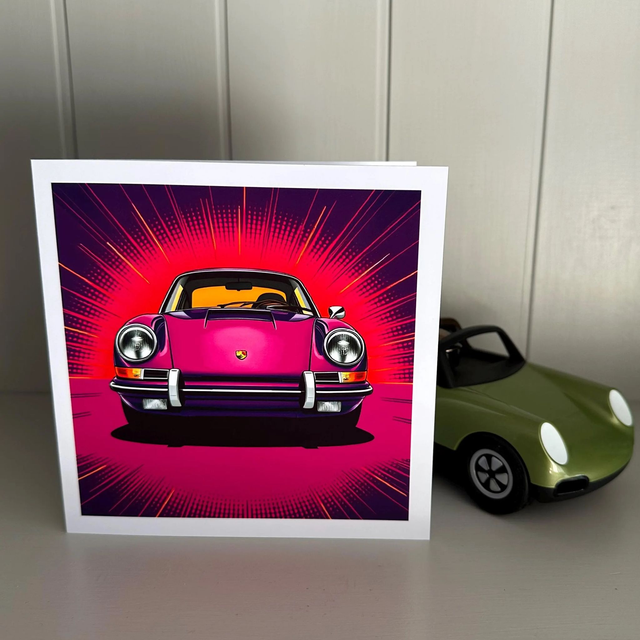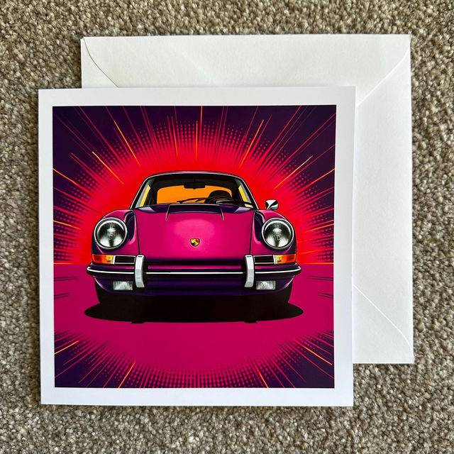 Square greetings card, 14.7cm x 14.7cm, with a reproduction of my digitally artwork of a classic purple Porsche 911 in a pop art style.