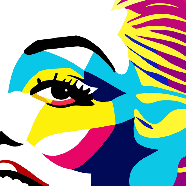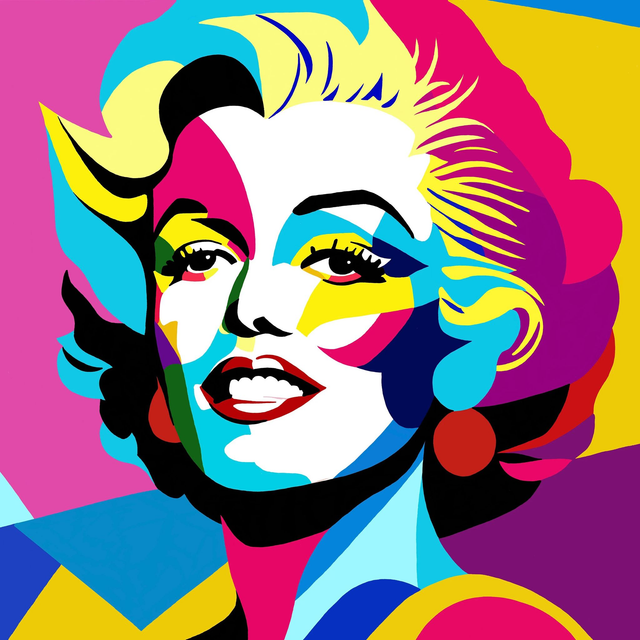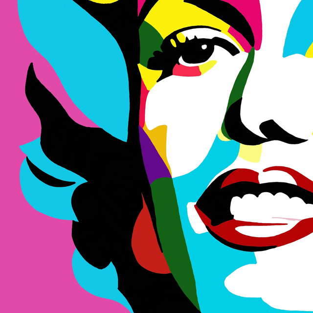 Pop art / Graphic art inspired digitally hand drawn abstract artwork of Marilyn Monroe in a bright colour palette.