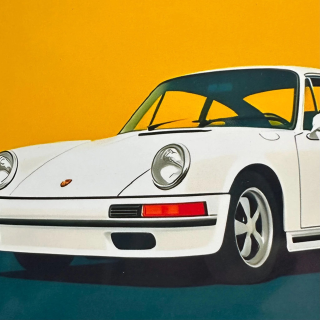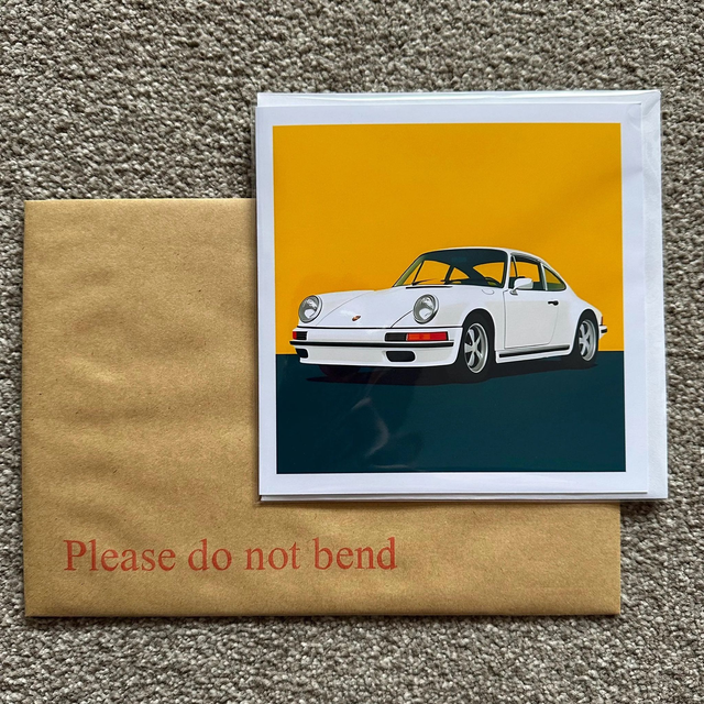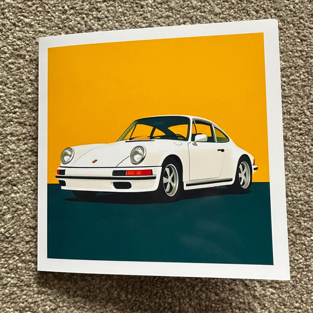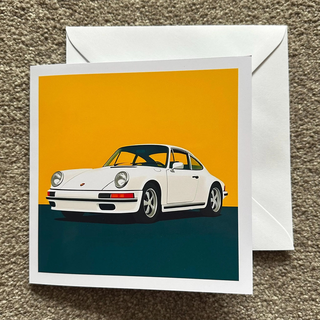 Square greetings card, 14.7cm x 14.7cm, with a reproduction of my digitally created artwork of a Classic Porsche 911 Restomod, early 911 styling cues based on a G series, in a pop art style.