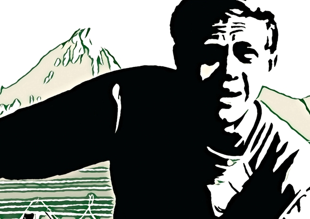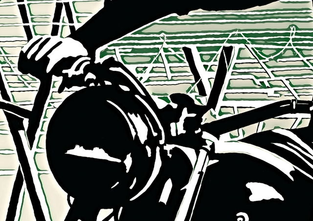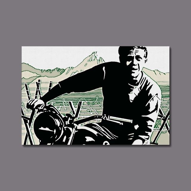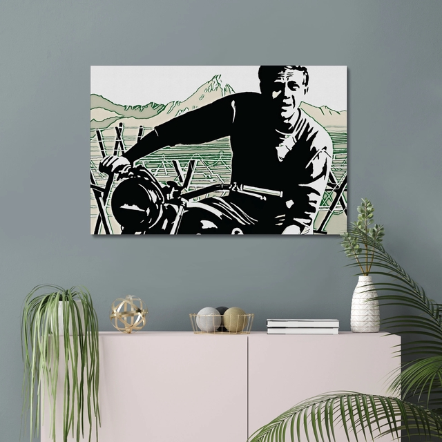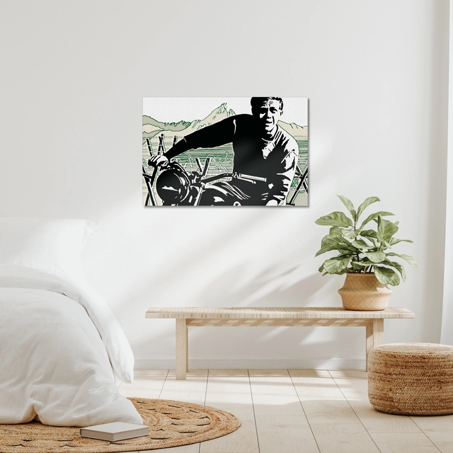 Hand drawn digital artwork showing Steve McQueen waiting to make the famous motorcycle jump in the 1963 film, The Great Escape. The artwork is printed on a stretched canvas and ready to hang and is available in one of four sizes.