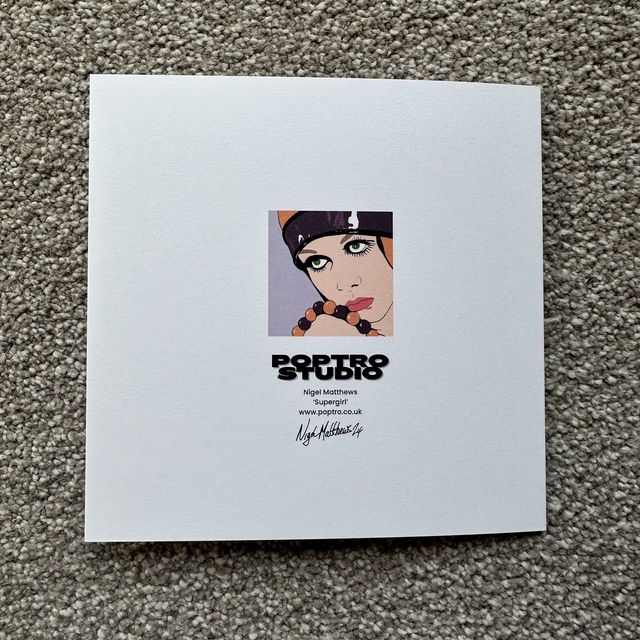 Blank greetings card, 14.8cm x 14.8cm, with a reproduction of my digitally hand drawn pop art inspired artwork of Supergirl.